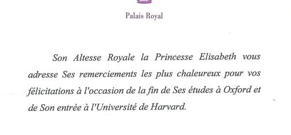 Royal response from Her royal Highness the Duchess of Brabant on the occasion of her graduation from Oxford and her acceptance of Harvard. The reply