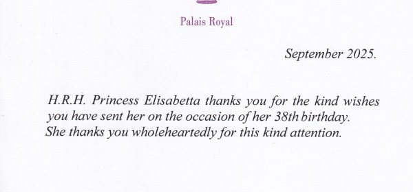 Royal response from Her Imperial and Royal Highness Princess Elisabetta of Belgium, Archduchess of Austria-Este on the occasion of her 38th birthday. Born Elisabetta Maria