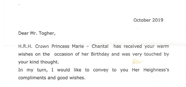Royal Response from Her Royal Highness The Crown Princess of Greece on the the occasion of her 51st birthday. The response is in the form