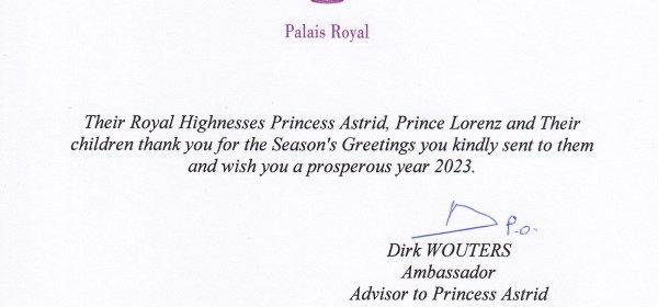 Royal response from Her Royal Highness Princess Marie-Esméralda of Belgium on the occasion of Christmas 2022 and the New Year 2023. The reply is in