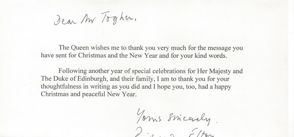 Royal response from Her Majesty The Queen on the occasion of Christmas 2017. The letter is sent from Sandringham House and signed by one of