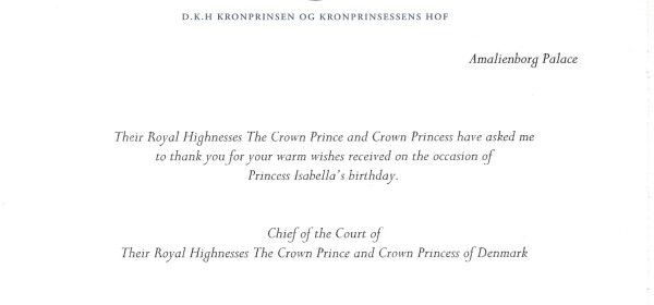 Royal Response from Their Royal Highness The Crown Prince and Crown Princess on the occasion of Her Royal Highness Princess Isabella’s 11th Birthday. Born Isabella