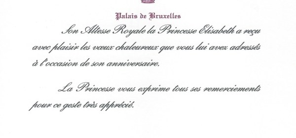 Royal response from Her Royal Highness The Duchess of Brabant on the occasion of her 19th birthday. Born Dutch: Elisabeth Theresia Maria Helena; French: Élisabeth Thérèse Marie Hélène on