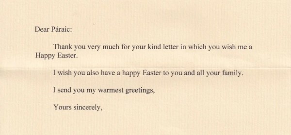 Response from The Most Excellent The Duke of Alba on the occasion of Easter 2023. The reply is in the form of a letter thanking