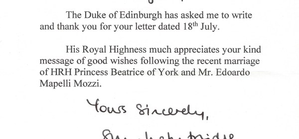 Royal response from His Royal Highnesses The Duke of Edinburgh in response from a letter I sent on the occasion of the wedding of Her