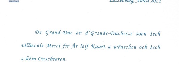 Royal response from Their Royal Highnesses The Grand Duke and Grand Duchess of Luxembourg on the occasion of Easter 2021. The reply is in the