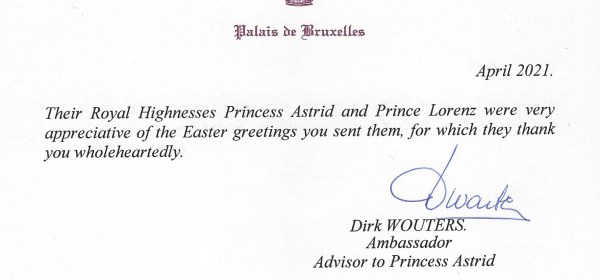 Royal response from Their Royal Highnesses Prince Laurent and Princess Claire of Belgium on the occasion of Easter 2021. The reply is in the form