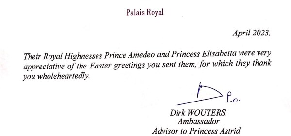 Royal response from Their Imperial and Royal Highnesses Prince Amedeo and Princess Elisabetta of Belgium, Archduke and Archduchess of Austria-Este on the occasion of Easter