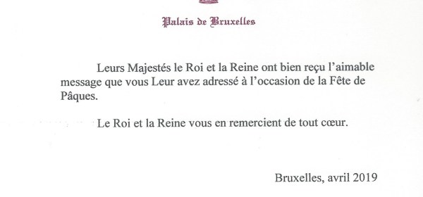 Royal response from their Majesties the King and Queen of Belgium for Easter. Card Translation Their Majesties the King and the Queen have received the