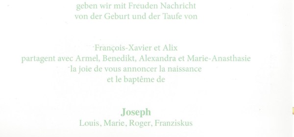 Response from Alex Fraye, Countess d’Harambure and Xavier Fraye on the occasion of Easter 2019. The reply is in the form of a card which