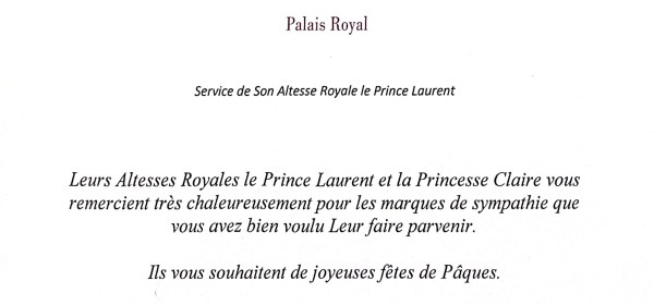 Royal response from Their Royal Highnesses Prince Laurent and Princess Claire of Belgium on the occasion of Easter 2023. The reply is in the form