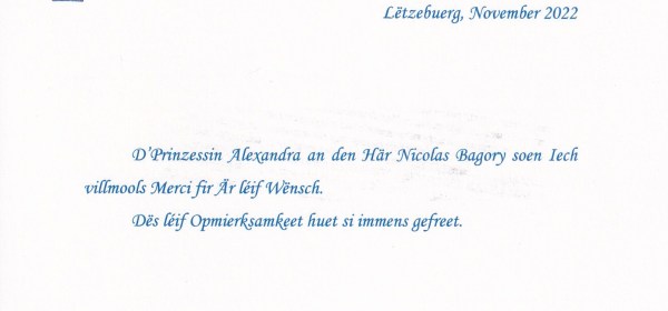 Royal responses from Her Royal Highness Princess Alexandra of Luxembourg and Mr. Nicolas Bagory on the occasion of their engagement. Born Alexandra Joséphine Teresa Charlotte