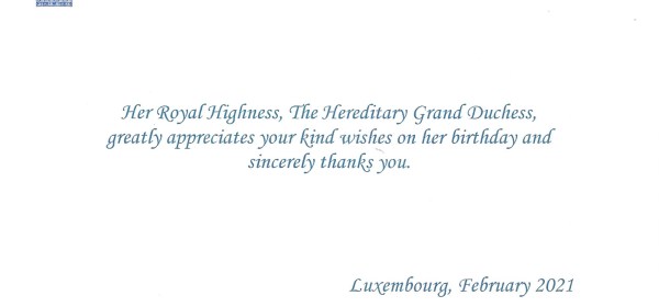 Royal response from Her Royal Highness The Hereditary Grand Duchess of Luxembourg on the occasion of her 36th birthday. Her Royal Highness is the husband