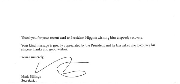 Response from His Excellency The President of Ireland (An Uachtaráin na hÉireann) in response to my get well soon wishes. Born Michael Daniel on 18th