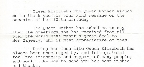 Royal response from her Majesty The Queen Mother on the occasion of her 100th Birthday. The reply is in the form of a letter send