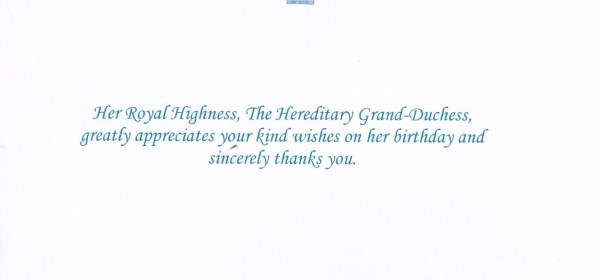 Royal response from Her Royal Highness The Hereditary Grand Duchess of Luxembourg on the occasion of her 41st birthday. Born Stéphanie Marie Claudine Christine on