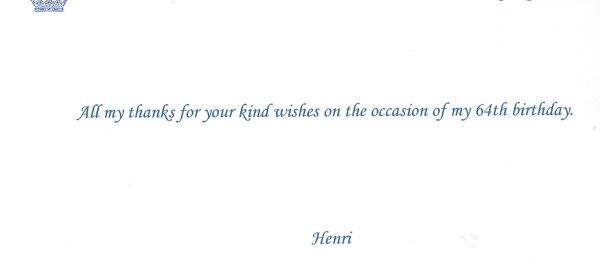 Royal response from His Royal Highness the Grand Duke of Luxembourg on his 64th birthday. Born on the 16th April 1955 to Grand Duke Jean