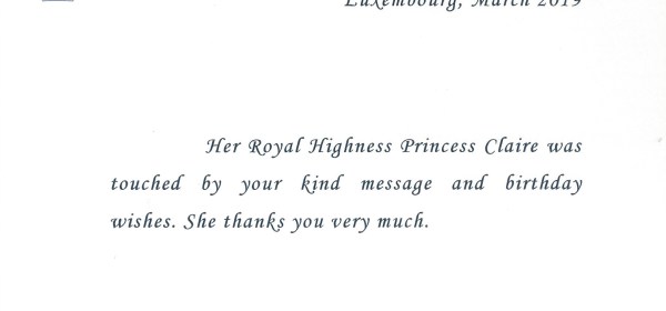 Royal response from Her Royal Highness Princess Claire of Luxembourg on the occasion of her 34th birthday. Princess Claire born Claire Lademacher on 21st March 1985. She