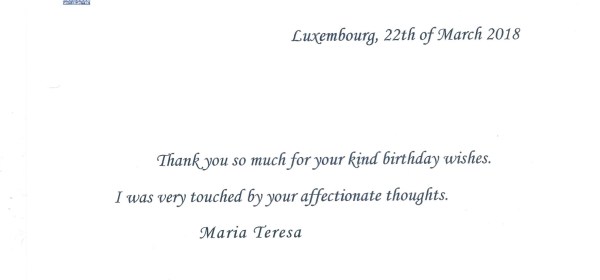 Responses from Her Royal Highness The Grand Duchess of Luxembourg on her 62nd birthday. The response is in the form of a card, thanking me
