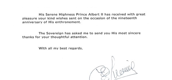 Royal response from His Serene Highness The Prince of Monaco on the 19th anniversary of his accession to The Throne of Monaco. His Serene Highness