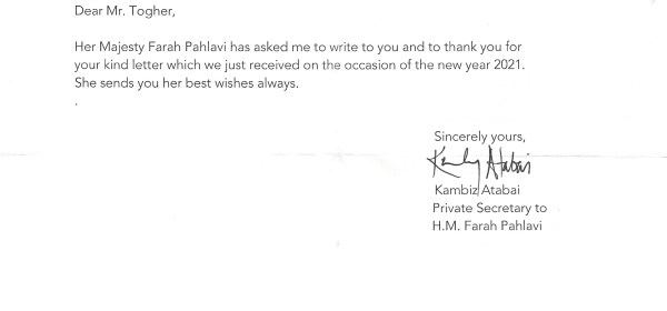 Royal response from Her Imperial Majesty The Empress of Iran on the occasion of the New Year 2021. The reply is in the form of