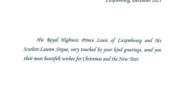 Royal response from His Royal Highness Prince Louis of Luxembourg and Miss Scarlett-Lauren Sirgue on the occasion of Christmas 2021 and the New Year 2022. The
