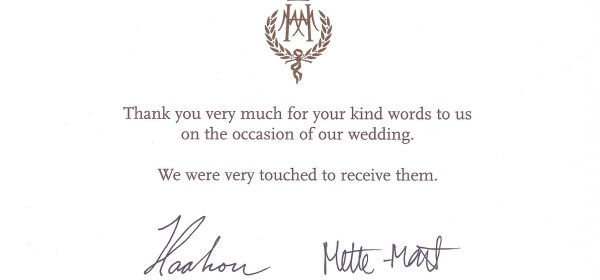 Royal response from Their Royal Highnesses The Crown Prince and Crown Princess of Norway on the occasion of their wedding. They married on 25th August