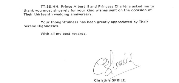 Royal response from Their Serene Highnesses The Prince and Princess of Monaco on the occasion of their 13th wedding anniversary. The couple married in a