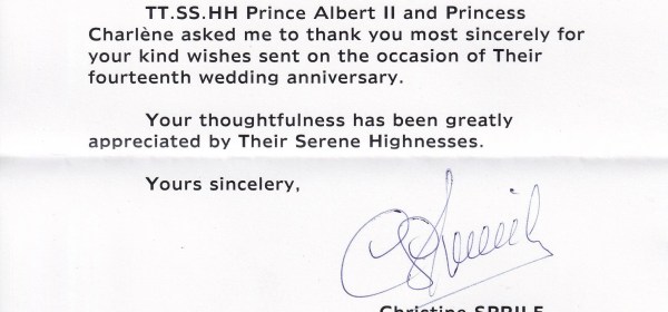 Royal response from Their Serene Highnesses The Prince and Princess of Monaco on the occasion of their 14th wedding anniversary. The couple married in a