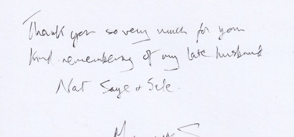 Response from The Right Honourable Mariette, The Dowager Baroness of Saye and Sele on the passin gof her husband The Right Honourable Nathaniel Fiennes, The