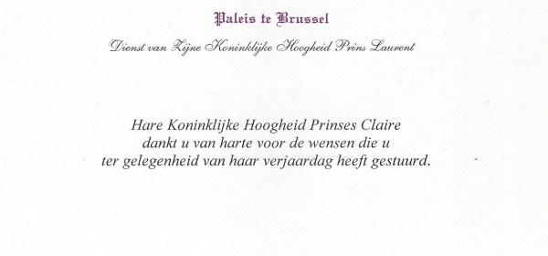 Royal response from Her Royal Highness Princess Claire of Belgium on the occasion of 46th birthday. Born Claire Louise on 18th January 1974 in Bath,