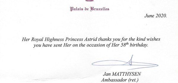 Royal response from Her Imperial and Royal Highness Princess Astrid of Belgium, Archduchess of Austria-Este on the occasion of her 58th birthday. Born Astrid Joséphine-Charlotte