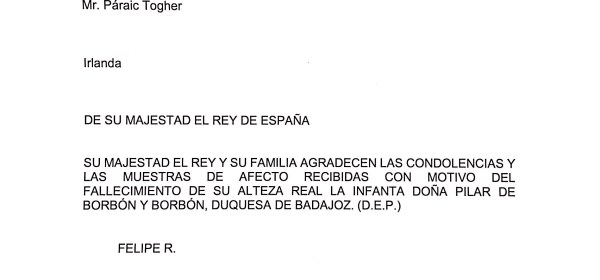 Royal response from His Majesty The King of Spain on the passing of his aunt Her Royal Highness Infanta Pilar, Duchess of Badajoz, Viscountess of