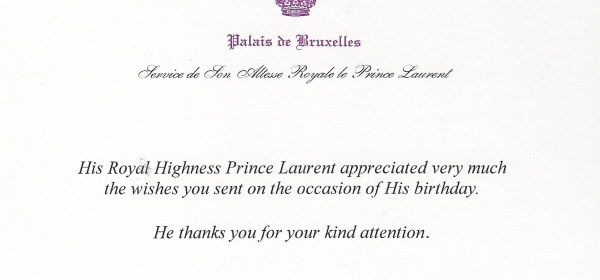 Royal response from His Royal Highness Prince Laurent of Belgium on the occasion of his 56th birthday. His Royal Highness is the second son and