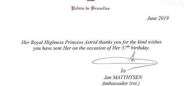 Royal response from Her Imperial and Royal Highness Princess Astrid of Belgium, Archduchess of Austria-Este. The response is a typical Belgium Royal Family reply in the