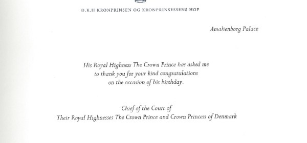 Royal response from His Royal Highness The Crown Prince of Denmark on the occasion of his 51st Birthday. The reply is typical of Denmark been