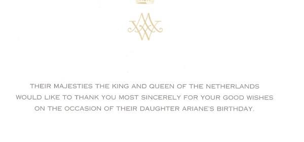 Royal Response from Their Majesties The King and Queen of the Netherlands on the occasion of their daughter Her Royal Highness Princess Ariane of the