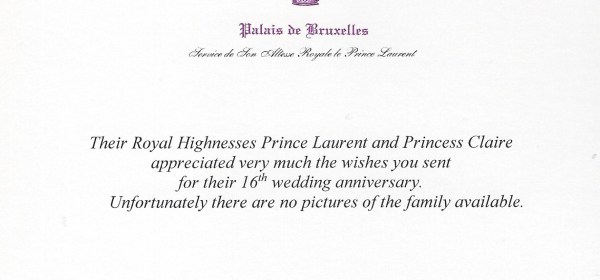 Royal Response from their Royal Highness Prince Laurent and Princess Claire of Belgium on the occasion of their 16th wedding. Prince Laurent and Princess Claire married on the