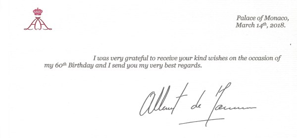 Reply from His Serene Highness Prince Albert II of Monaco on the occasion of his 60th birthday. It is different from Princess Charlene’s in that