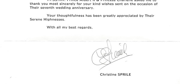 The 7th wedding anniversary reply of Their Serene Highnesses The Prince and Princess of Monaco. it was a lovely letter signed by Christine Sprile but