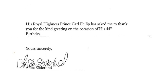 Royal response from His Royal Highness Prince Carl Philip of Sweden, Duke of Värmland on the occasion of his 44th birthday. Born Carl Philip Edmund