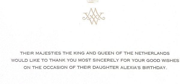 Royal response from Their Majesties The King and Queen of the Netherlands on the occasion of their daughter Her Royal Highness Princess Alexia of the