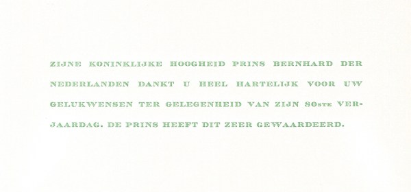 Royal response from His Royal Highness Prince Bernhard of the Netherlands on the occasion of his 80th birthday. Born Bernhard Friedrich Eberhard Leopold Julius Kurt