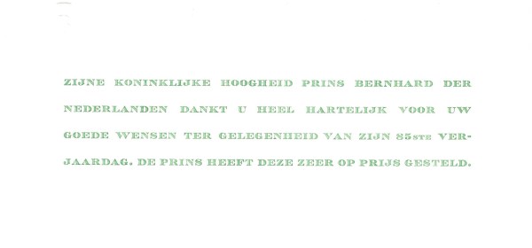 Royal response from His Royal Highness Prince Bernhard of the Netherlands on the occasion of his 85th birthday. Born Bernhard Friedrich Eberhard Leopold Julius Kurt