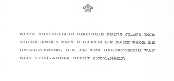 Royal response from His Royal Highness The Prince Consort of the Netherlands on the occasion of his 55th birthday. Born Klaus-Georg Wilhelm Otto Friedrich Gerd