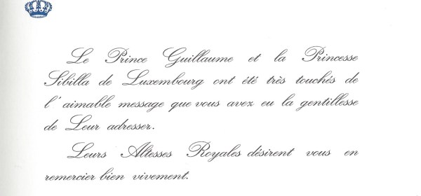 Royal response from Their Royal Highnesses Prince Guillaume and Princess Sibilla of Luxembourg on the occasion of their 25th wedding anniversary. Prince Guilluame is the