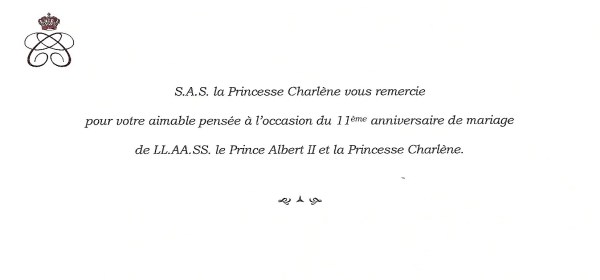 Royal response from Their Serene Highnesses The Prince and Princess of Monaco on the occasion of their 11th wedding anniversary t. The couple married in