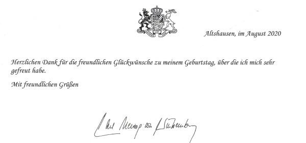 Royal response from His Royal Highness The Duke of Württemberg on the occasion of his 84th birthday. Born Carl Maria Peter Ferdinand Philipp Albrecht Joseph