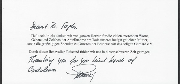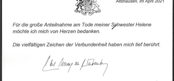 Royal response from His Royal Highness The Duke of Württemberg of on the passing of his sister Duchess Helene of Württemberg, Markgräfin Pallavicini. Born Helene
